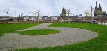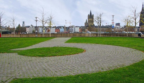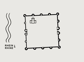 Im modernen Pflaster werden zwei Zwischentürme von Kastell Divitia mit ihren angrenzenden Mauerabschnitten nachgezeichnet. Die mächtigen Wehrmauern verfügen über weit vorgeschobene Rundtürme. Sie gehen auf ein neues Verteidigungskonzept der römischen Grenztruppen zurück. Auf den Türmen standen Pfeilgeschütze, die den angreifenden Feind auch seitlich unter Beschuss nehmen konnten.