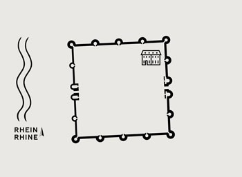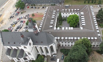 Der quadratische Grundriss des ehemaligen Klostergebäudes ergibt sich aus der Lage in der nordöstlichen Ecke von Kastell Divitia. Man nutzte die antiken Mauerzüge als Grundmauern des mittelalterlichen Klosters. Nach der Zerstörung im Zweiten Weltkrieg wurde das Gebäude wieder aufgebaut, wobei man die Fassade des historischen Erscheinungsbildes wieder aufgriff.