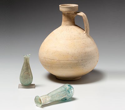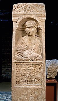 „Mein Lieblingsstück in der Ausstellung 14 AD ist das Grab der Bella aus Reims. Bella war Gallierin, sie kam aus der Champagne in Frankreich und sie starb hier in Köln im Kindbett. Ihr Mann Longinus, der nicht gut Latein sprach – war wohl auch Gallier – hat sie hier körperbestatten lassen, wie es in Gallien Tradition gewesen war. Und so bekam sie nur ein einziges, kleines Krüglein mit ins Grab und als Grabgeschenke zwei gläserne Parfümfläschchen. Aber nach römischer Tradition, nach stadtrömischer Sitte, hat er ihr einen Grabstein errichten lassen, was in Gallien gar nicht üblich war. Und er zeigte die Bella so, wie es in Oberitalien üblich war: Ein Brustbild mit dem Säugling im Arm. Der Säugling ist in der Inschrift nicht genannt. Wahrscheinlich hatte er noch keinen Namen und war vor dem neunten Tag gestorben.“
