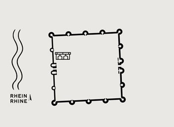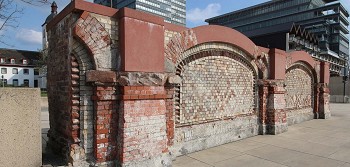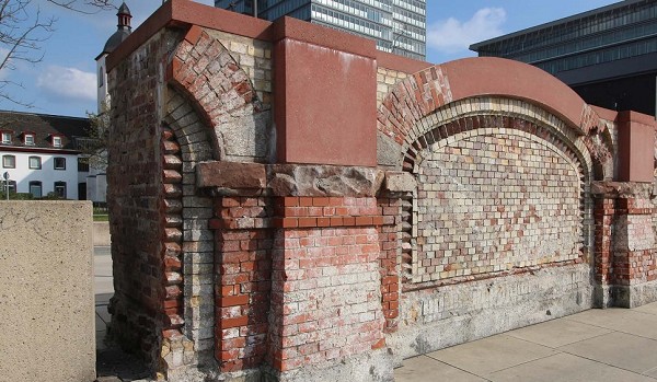 Am Deutzer Ufer wurde zwischen 1879 und 1882 über einem Erdwall der Kopfbahnhof der Bergisch-Märkischen Eisenbahn errichtet. Die rheinseitige Mauer des Bahndamms war mit farbigen Ziegeln verziert. Die Ingenieure errichteten sie auf den Fundamenten des römischen Kastells. 1913 gab man den Bahnhof mit der Inbetriebnahme des heutigen Bahnhofs Deutz auf.